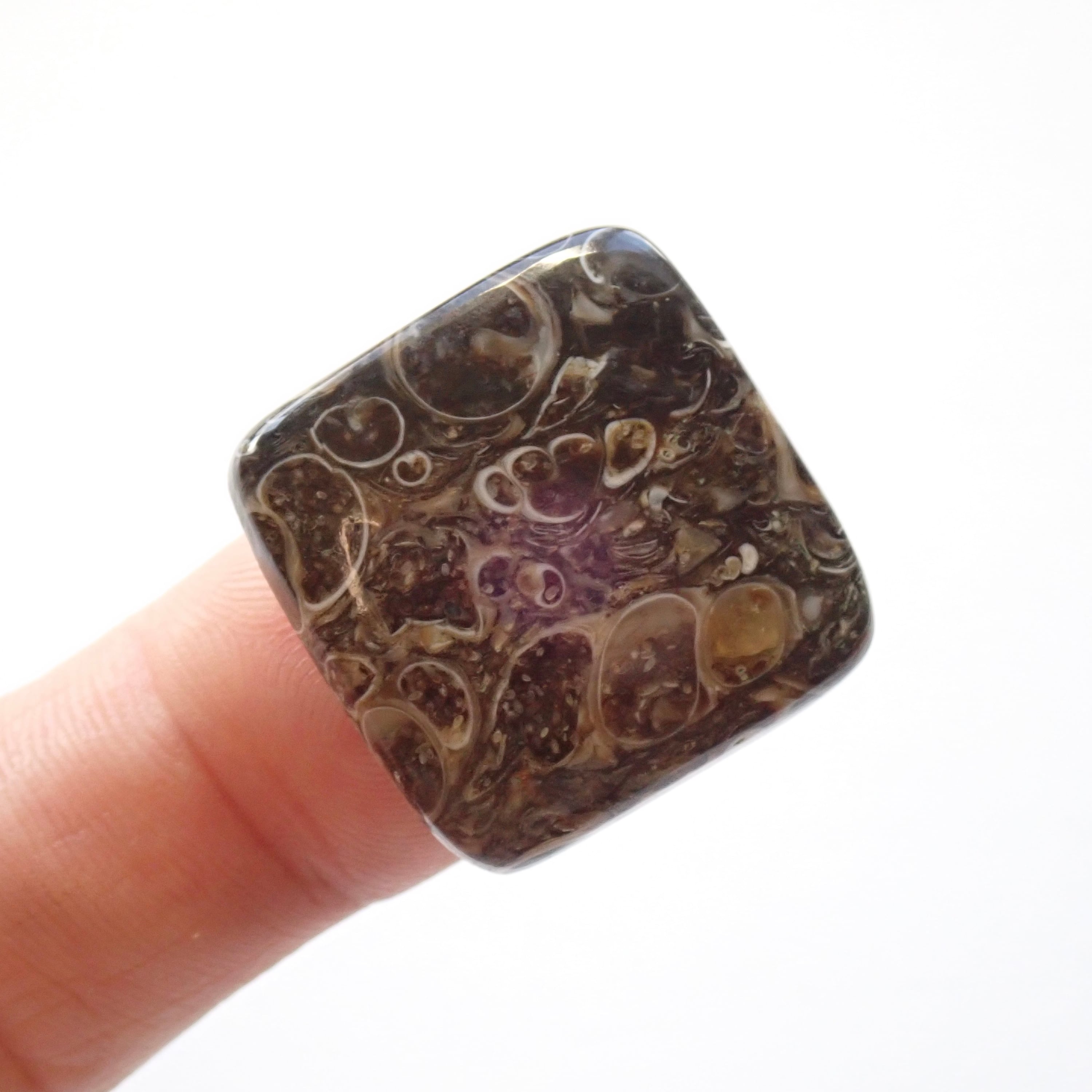 巻貝の「ツリテラ」という化石の形が、そのまま瑪瑙化して独特なデザインとなった石です。