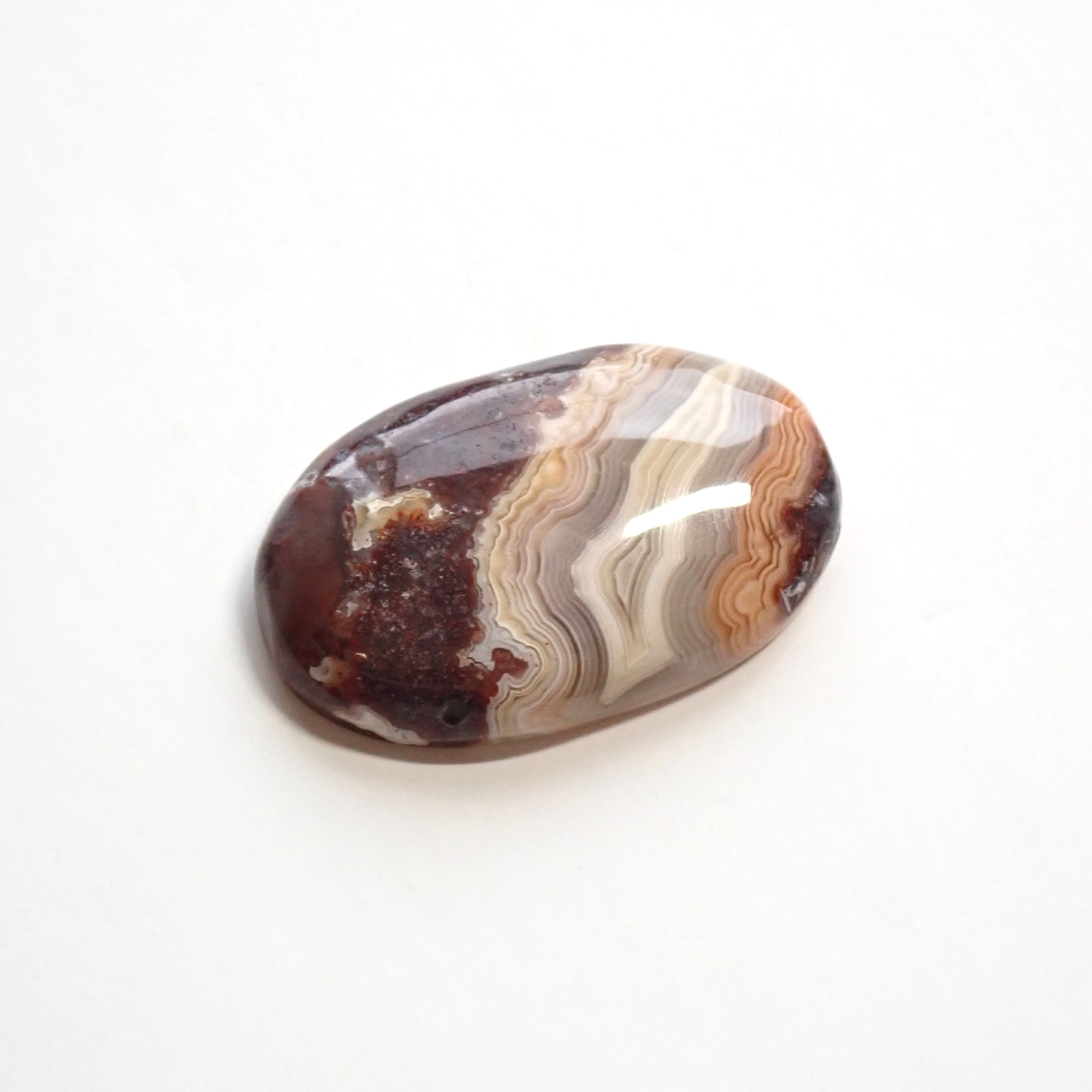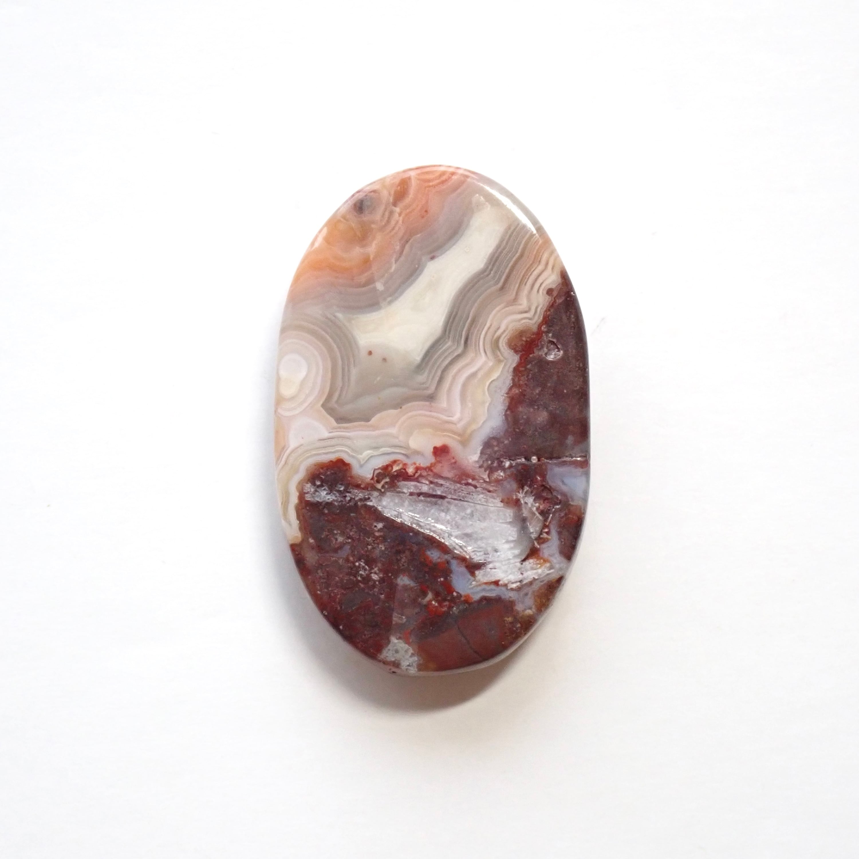 不均等に複雑に入り込んだ迷界な網様、赤や白に茶色やグレー等入り交わった多様な色を持ちます。まるでマグマの地層化のような名前らしいクレイジーレースアゲート。