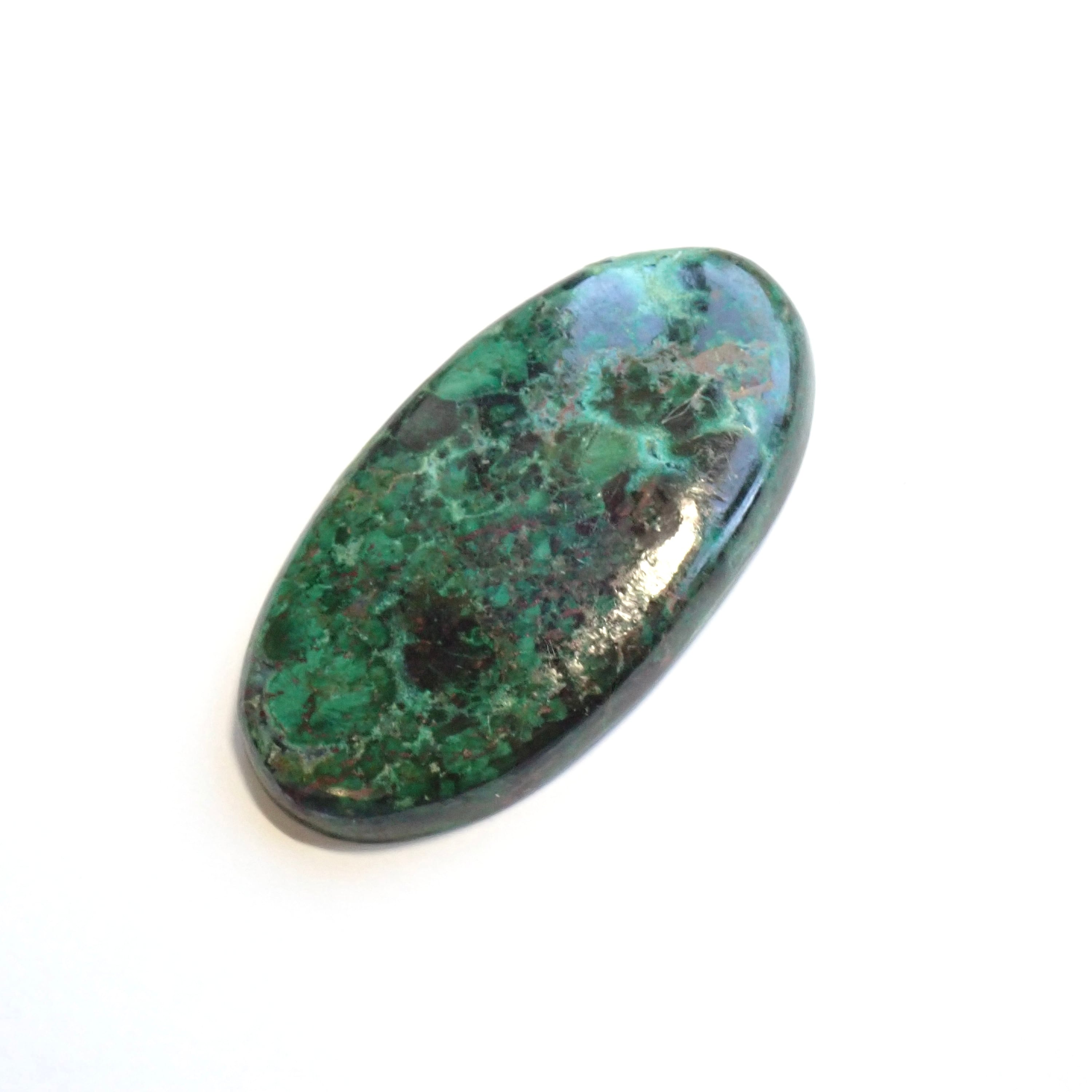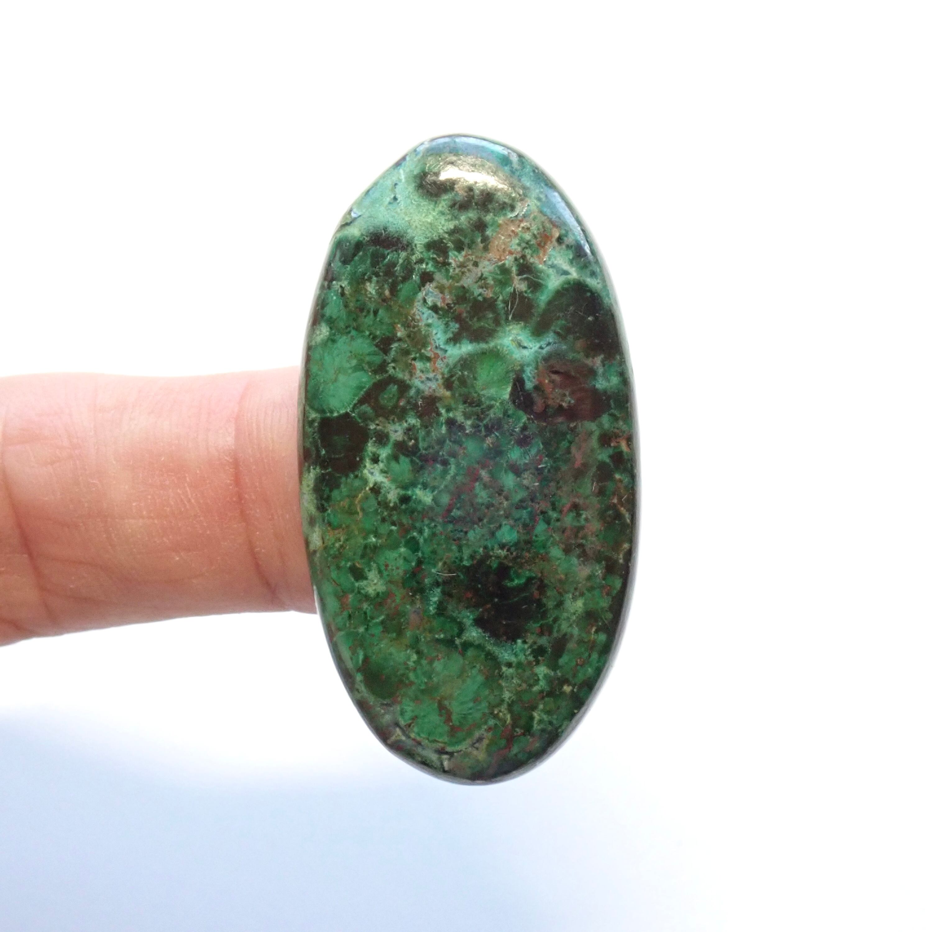 マラカイト色が強い濃い緑色と、結晶を内包したドュルージーが少し垣間見れるルースになります。主張が強くクリソコラの中ではインパクトのある発色をしています。